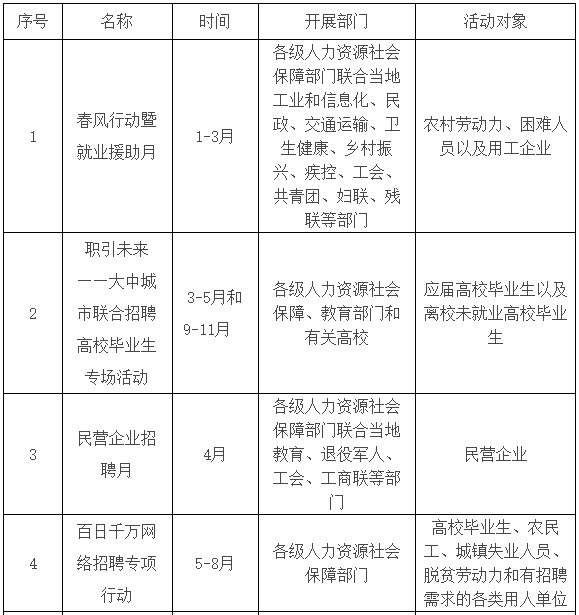 (六)金秋招聘月。10-11月,以招聘需求較大的民營企業(yè)、中小企業(yè)等用人單位為重點(diǎn)對象,由各級人力資源社會保障部門聯(lián)合當(dāng)?shù)孛裾⑼艘圮娙?、工會、工商?lián)開展,幫助企業(yè)解決招工穩(wěn)崗難題,促進(jìn)人力資源供需對接。