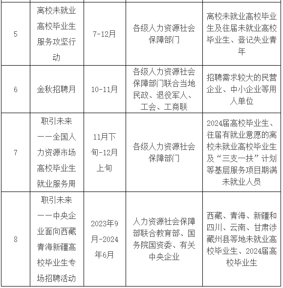(八)職引未來——中央企業(yè)面向西藏青海新疆高校畢業(yè)生專場招聘活動。2023年9月-2024年6月,以西藏、青海、新疆和四川、云南、甘肅涉藏州縣等地未就業(yè)高校畢業(yè)生、2024屆高校畢業(yè)生為重點(diǎn)對象,由人力資源社會保障部聯(lián)合教育部、國務(wù)院國資委、有關(guān)中央企業(yè)開展,舉辦專場招聘活動。